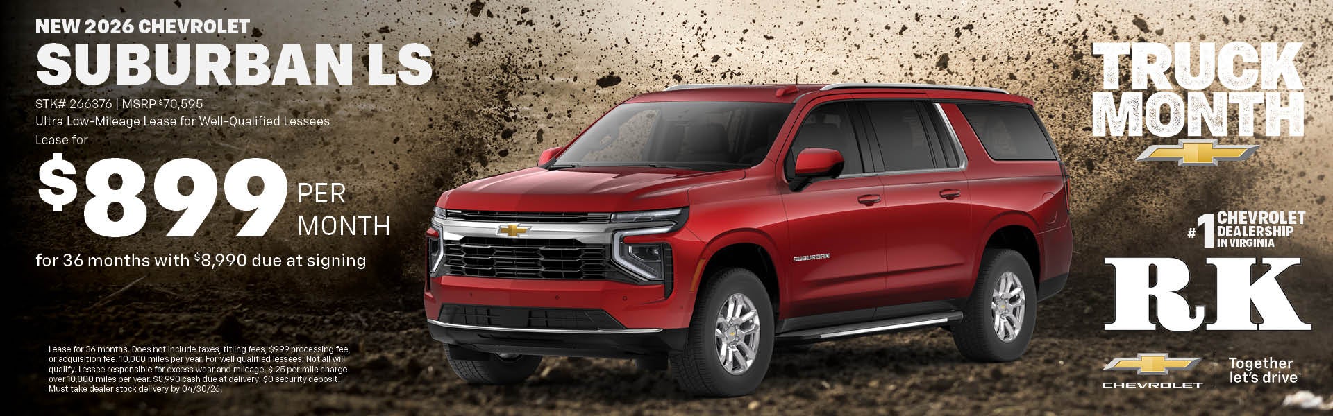 Lease for 36 months. Plus tax and all applicable fees. 10,000 miles per year. For well qualified lessees. Not all will qualify. Lessee responsible for excess wear and mileage. $.25 per mile charge over 10,000 miles per year. $8,990 cash due at delivery. $0 security deposit. Must take dealer stock delivery by 04/30/26.