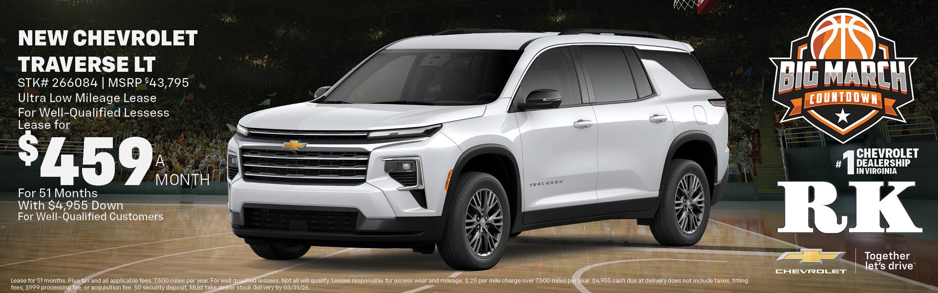 Lease for 51 months. Plus tax and all applicable fees. 7,500 miles per year. For well qualified lessees. Not all will qualify. Lessee responsible for excess wear and mileage. $.25 per mile charge over 7,500 miles per year. $4,955 cash due at delivery does not include taxes, titling fees, $999 processing fee, or acquisition fee. $0 security deposit. Must take dealer stock delivery by 03/31/26.