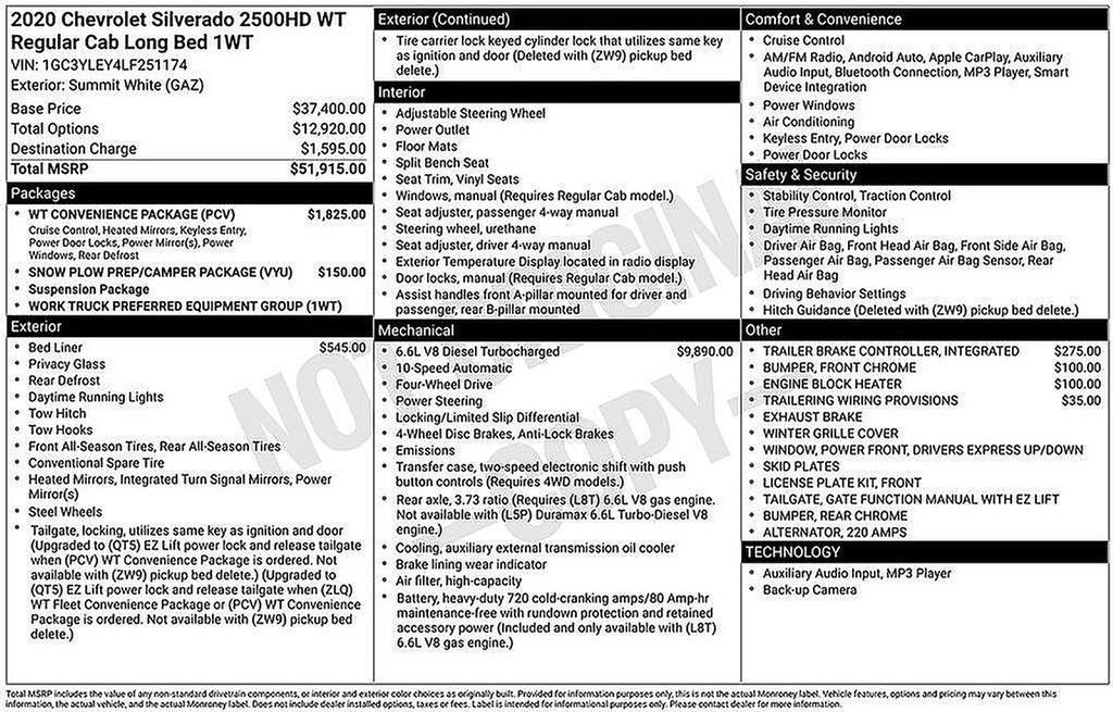 Summit White 2020 Chevrolet Silverado 2500HD Work Truck 4WD 10-Speed Automatic Duramax 6.6L V8 Turbodiesel