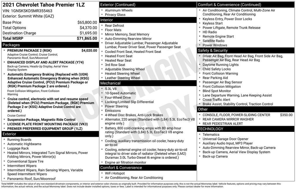 Tahoe Premier, EcoTec3 5.3L V8, 4WD, Jet Black/Maple Sugar Leather, 15 Diagonal Multi-Color Head-Up Display, 1st & 2nd Row Color-Keyed Carpeted Floor Mats, 2 USB Data Ports, 2-Speed Active Electronic AutoTrac Transfer Case, 3rd Row 60/40 Power-Folding Split-Bench Seat, Adaptive Cruise Control, Auto-Dimming Inside Rear-View Mirror, Automatic Heated Steering Wheel, Bright Front & Rear Door Sill Plates, Chrome Door Handles w/Body-Color Strip, Chrome Mirror Caps, Color-Keyed Carpeting Floor Covering, Driver & Front Outboard Passenger Airbags, Dual Exhaust System, Dual-Pane Power Panoramic Sunroof, Enhanced Display & Alert Package, Enhanced Driver Information Center, Floor Console w/Storage Area, Front & Rear Park Assist, Hands-Free Rear Power Programmable Liftgate, HD Radio, HD Surround Vision, Heated 2nd Row Outboard Seats, Hill Descent Control, Infotainment Display, Inside Rearview Auto-Dimming Rear Camera Mirror, Lane Change Alert w/Side Blind Zone Alert, Lane Keep Assist w/Lane Departure Warning, Leather-Wrapped Steering Wheel, LED Daytime Running Lamps, License Plate Front Mounting Package, Memory Settings, Navigation System, Outside Heated Power-Adjustable Mirrors, Power Release 2nd Row Bucket Seats, Power Tilt & Telescopic Steering Column, Preferred Equipment Group 1LZ, Premium Package 2, Rear Camera Mirror Washer, Rear Cross Traffic Alert, Rear Pedestrian Alert, Remote Start, Safety Alert Seat, SiriusXM NavTraffic, SiriusXM Radio w/360L, Universal Home Remote.
